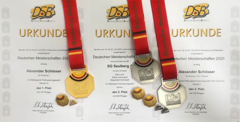 Vom 18.07. - 20.07. fanden in Hannover die Deutschen Meisterschaften im Vorderladerschießen statt. Alexander Schösser zählte nach seinem erfolgreichen Abschneiden bei den Landesmeisterschaften zum engeren Favoritenkreis. Gleich am ersten Wettkampftag bestätigte er mit neuer persönlicher Bestleistung von 145 Ringen mit dem Perkussions-Dienstgewehr (Stehend) seine derzeitige Leistungsstärke und wurde in der offen ausgetragenen Klasse mit dem Silberrang belohnt. Mit dem Perkussionsgewehr startet er seit einigen Jahren im Rahmen einer Schießgemeinschaft für die SG Seulberg - dort konnte er sich mit Petra Leonhardt (143 Ringe) und Felix Lehr (145 Ringe) über eine weitere Silbermedaille freuen, die im Team-Wettbewerb errungen wurde. Er selbst steuerte 147 Ringe zum Mannschaftsergebnis von 435 Ringen bei und feierte damit gleichzeitig seinen dritten Deutschen Meistertitel im Einzel seit 2017.